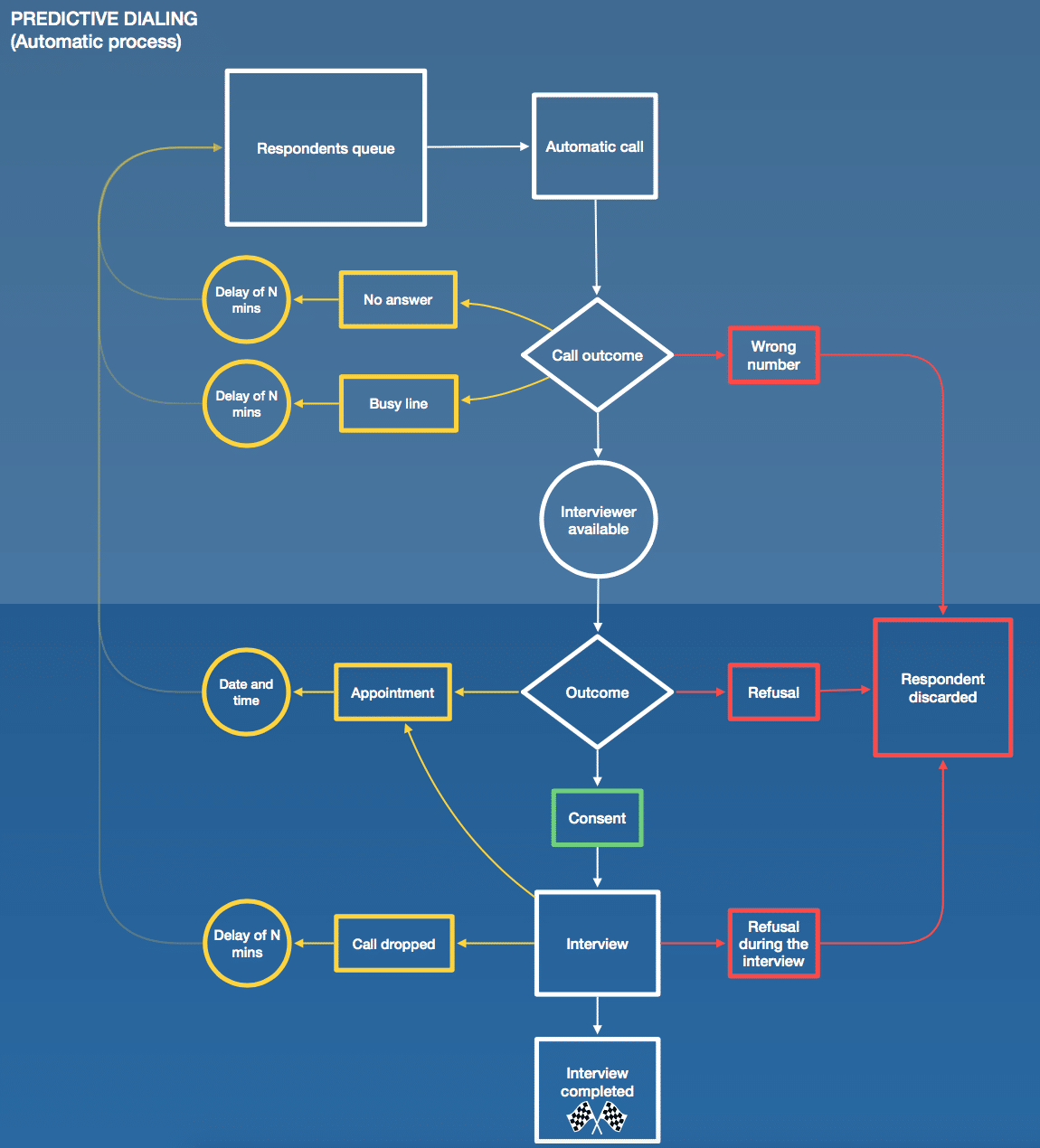 The time spent on call attempts can be crucial for survey costs. For this reason, a solution called “Predictive Dialing” be used to optimize the time. With Predictive Dialing, the dialer automatically manages all calls and forwards only contacts that answer the phone.